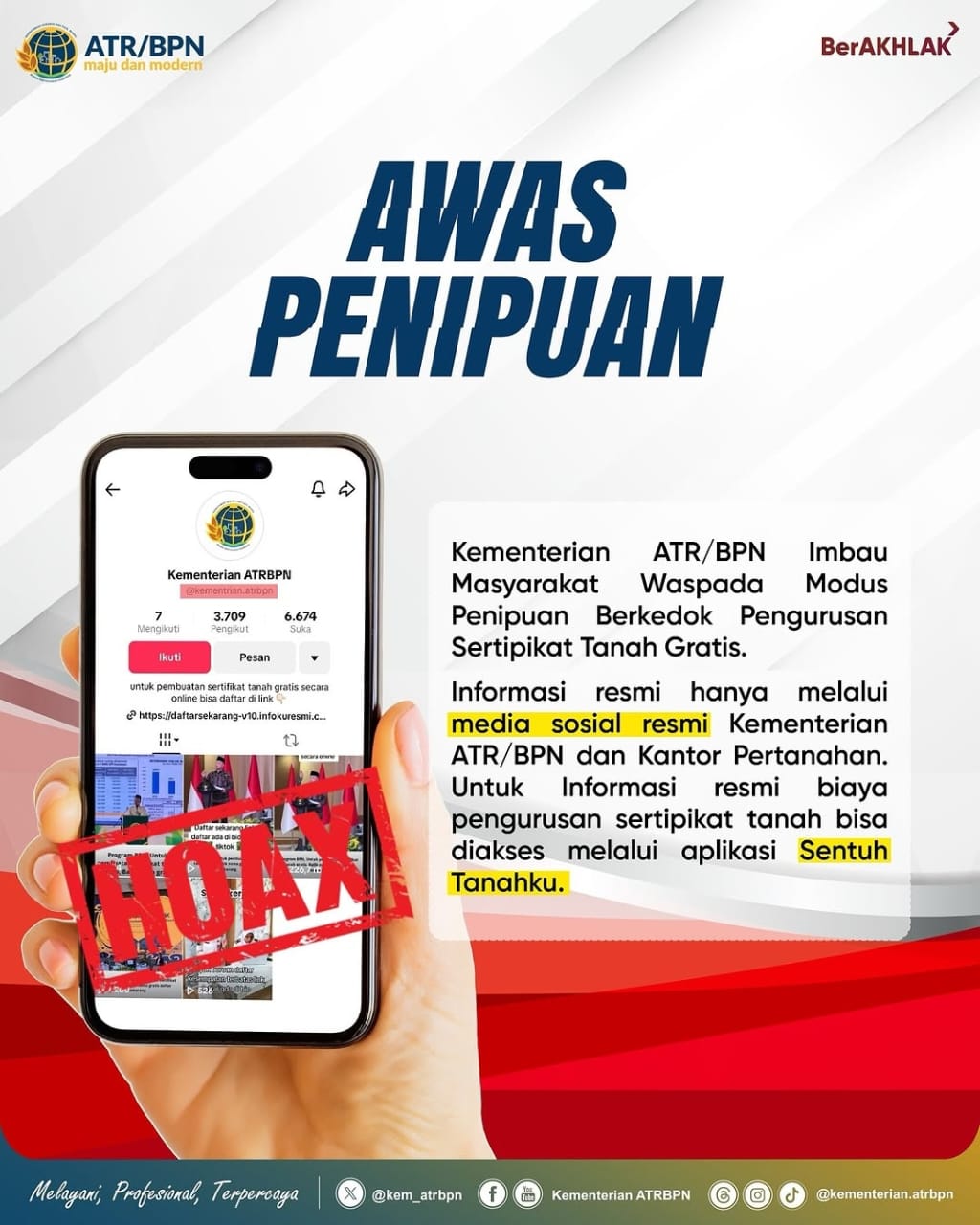 Kementerian ATR/BPN menegaskan bahwa seluruh informasi resmi terkait program, pelayanan, maupun kebijakan pertanahan hanya disampaikan melalui media sosial resmi Kementerian ATR/BPN dan Kantor Pertanahan di masing-masing daerah.