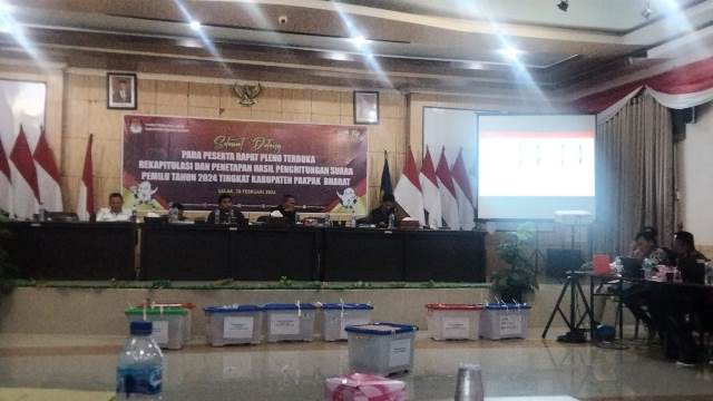 Rapat pleno terbuka rekapitulasi penghitungan suara Pemilu Serentak Tahun 2024 berjalan aman dan lancar digelar di Balai Sada Arih Panorama Indah Delleng Sindeka, Rabu (28/2/2024).