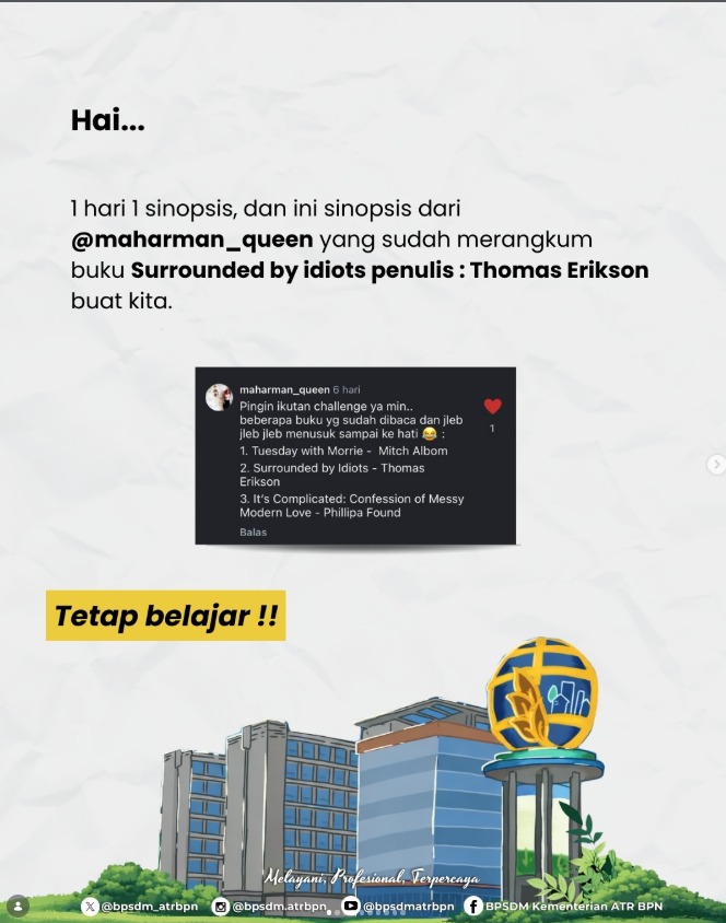 Serdang Bedagai | Harian.co.id,- Satu hari satu sinopsis, dan kali ini kita merangkum buku Surrounded by Idiots karya Thomas Erikson, yang sudah dirangkum oleh @maharman_queen untuk kita semua.