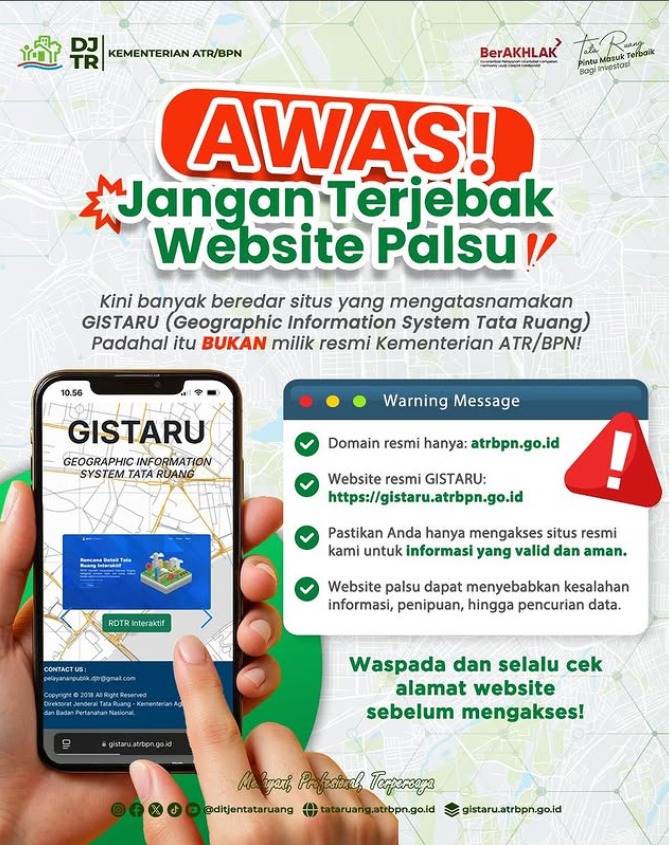Sebagai informasi, saat ini sedang marak website palsu GISTARU (Geographic Information System Tata Ruang). Akses GISTARU hanya di laman https://gistaru.atrbpn.go.id