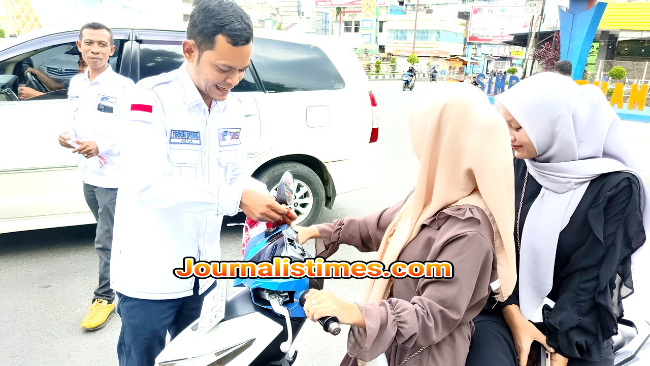 Ket.Gambar : Ketua SMSI Labuhanbatu Raya, Teguh Sitorus Saat Memasangkan Bendera Pada Pengguna Jalan.