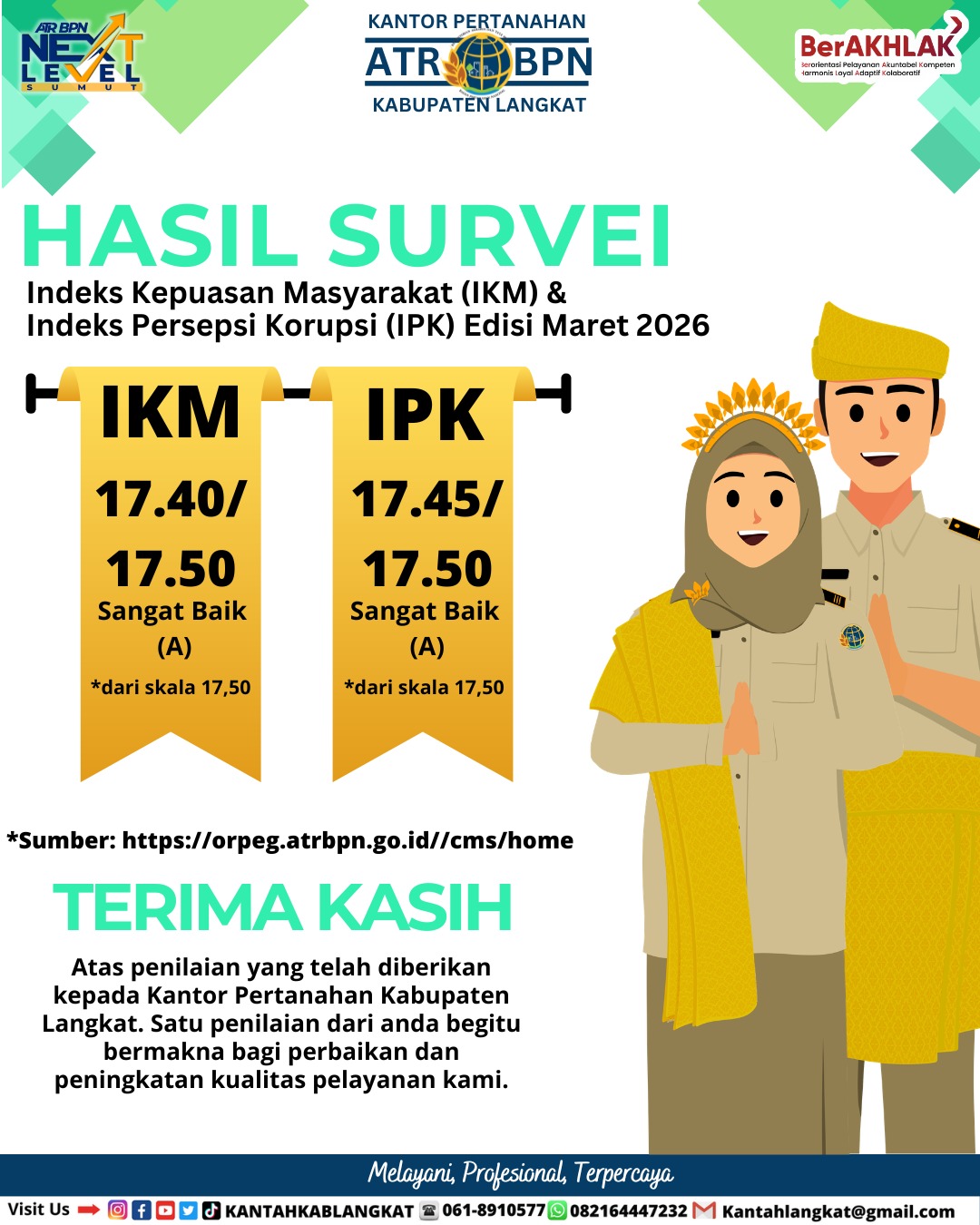 Berdasarkan hasil survei tersebut, nilai IKM mencapai 17,40 dari skala 17,50, sementara nilai IPK berada pada angka 17,45 dari skala 17,50. Capaian ini menjadi indikator bahwa kualitas pelayanan yang diberikan kepada masyarakat semakin meningkat, sekaligus menunjukkan tingkat kepercayaan publik yang tinggi terhadap integritas layanan di Kantor Pertanahan Kabupaten Langkat.