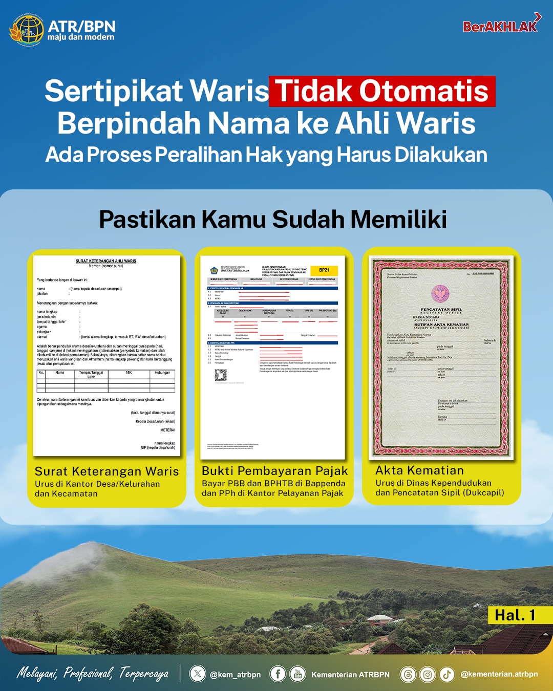 Dalam prosesnya, masyarakat perlu memastikan kelengkapan dokumen yang menjadi syarat administrasi, antara lain Surat Keterangan Waris dari kantor desa/kelurahan dan kecamatan, bukti pembayaran pajak seperti BPHTB dan PPh, serta akta kematian dari Dinas Kependudukan dan Pencatatan Sipil. Dokumen-dokumen ini menjadi dasar penting dalam pengajuan peralihan hak di Kantor Pertanahan.
