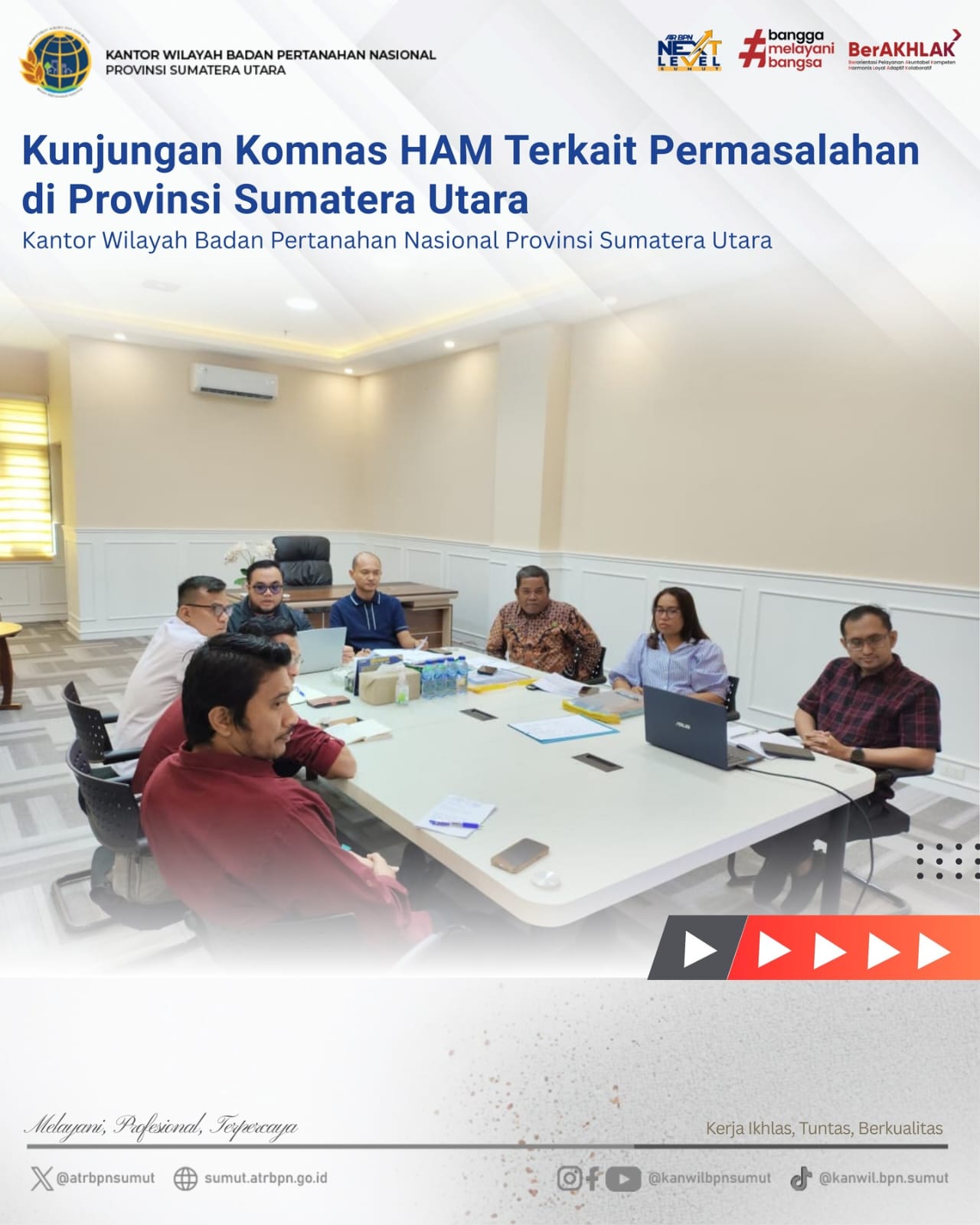 Medan | Harian.co.id,- Kantor Wilayah Badan Pertanahan Nasional (BPN) Provinsi Sumatera Utara menerima kunjungan Komisi Nasional Hak Asasi Manusia (Komnas HAM) dalam rangka membahas berbagai permasalahan pertanahan yang berkaitan dengan pemenuhan dan perlindungan hak asasi manusia.