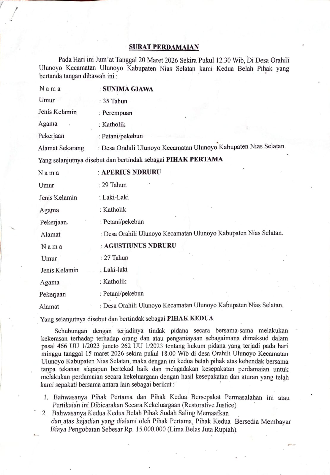 Namun, pada Jumat, 20 Maret 2026, kedua belah pihak sepakat menyelesaikan permasalahan tersebut secara kekeluargaan. Proses perdamaian berlangsung di hadapan Pemerintah Desa Orahili Ulunoyo dan dihadiri oleh Kepala Desa, tokoh masyarakat, serta keluarga dari kedua belah pihak, dengan disaksikan langsung oleh personel Kepolisian dari Polsek Lolowau.