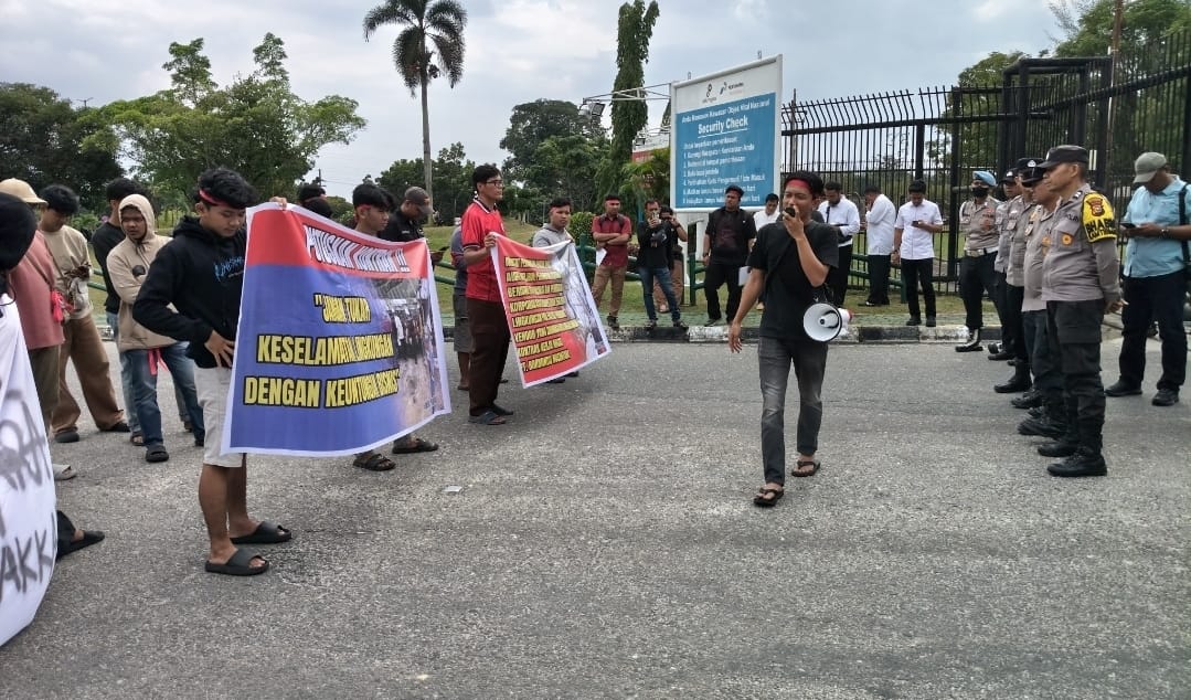 Massa yang tergabung dalam Sinergi Pemuda Riau menggelar aksi unjuk rasa di kantor Pertamina Hulu Rokan (PHR), Rumbai, Pekanbaru, Senin (9/2/2026). (Foto/Ist)