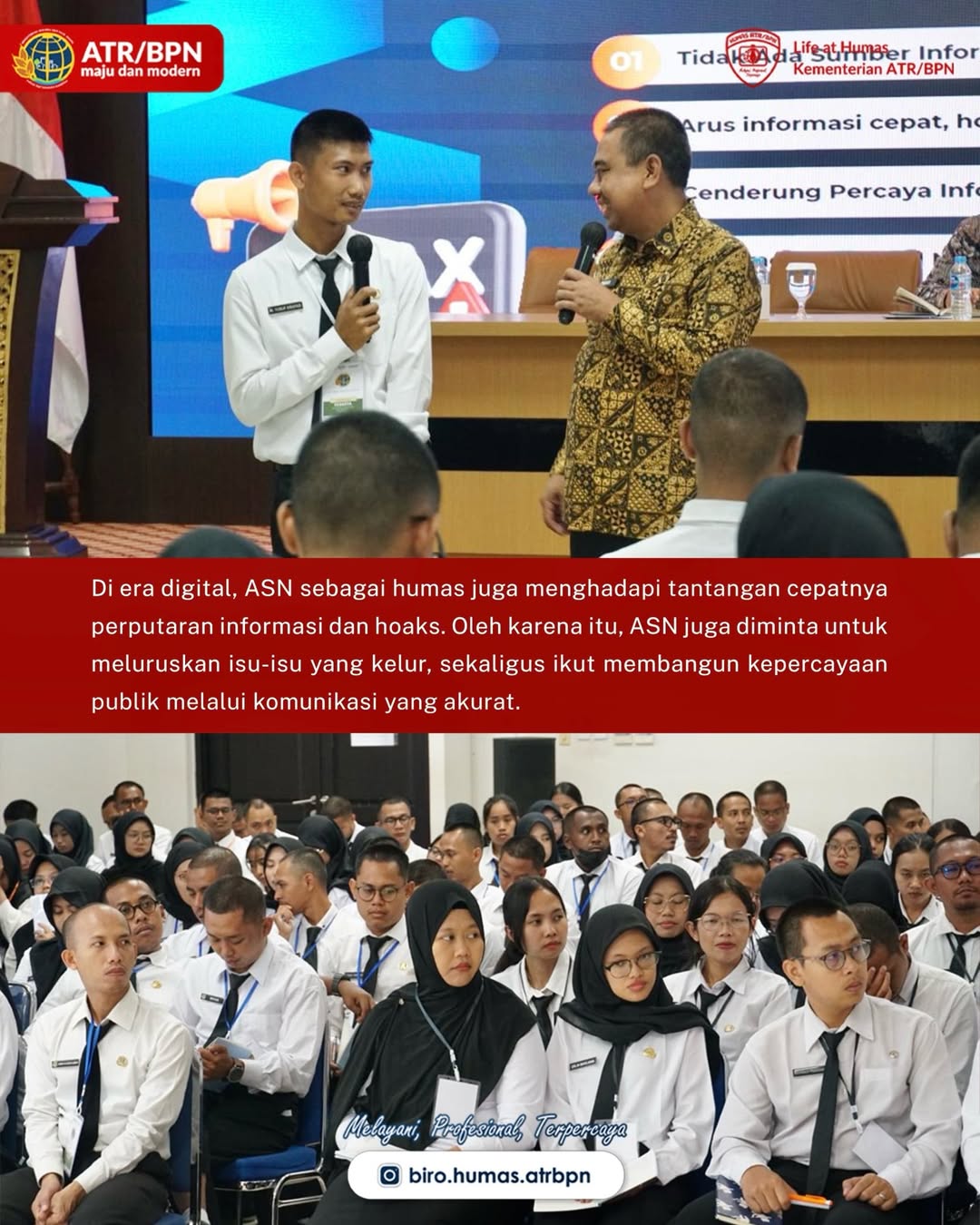 Kepala Bagian Pemberitaan, Media, dan Hubungan antar Lembaga (PMHAL) Biro Humas dan Protokol, Bagas Agung Wibowo, menegaskan bahwa setiap ASN adalah humas yang berperan penting dalam menyampaikan pesan, meluruskan informasi, serta membangun kepercayaan publik.