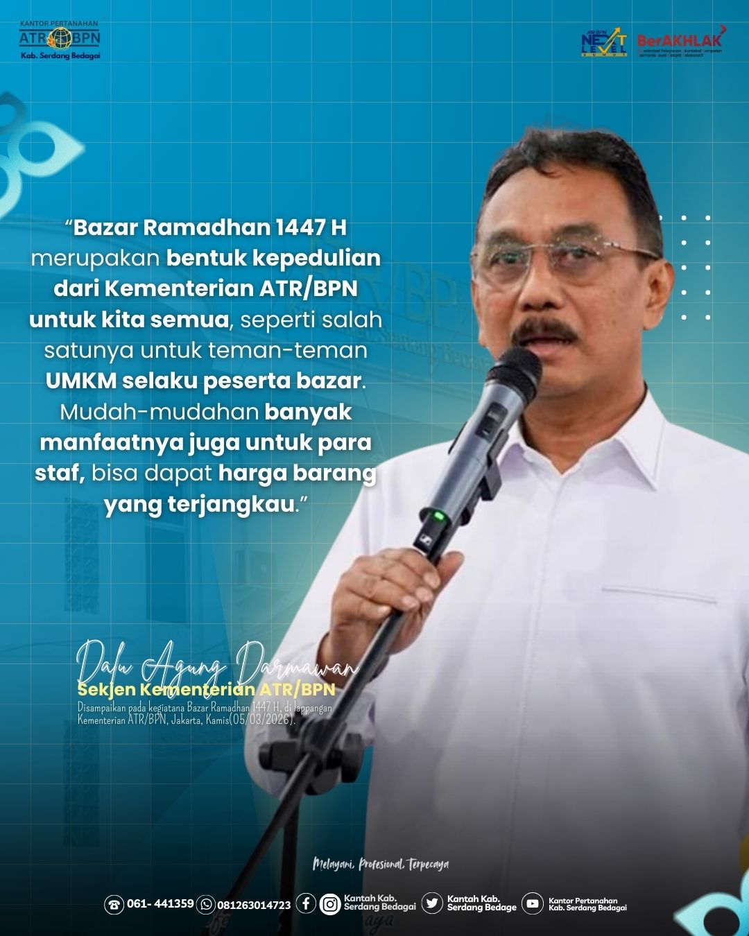 Sekretaris Jenderal ATR/BPN, Dalu Agung Darmawan, menyampaikan bahwa bazar ini menjadi bentuk kepedulian sekaligus sarana kebersamaan di bulan Ramadan. Dalam kegiatan ini juga diserahkan santunan dan bingkisan kepada 15 perwakilan keluarga besar ATR/BPN, sebagai wujud solidaritas dan kepedulian terhadap sesama.