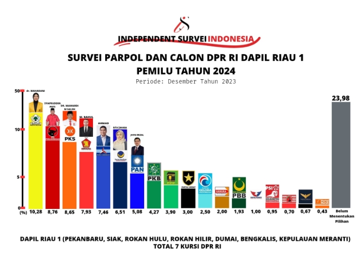 Pekanbaru – Journalistimes.com. Independen Survey Indonesia pada Awal Januari merilis hasil survey parpol dan Calon DPR RI Dapil Riau 1 pemilu tahun 2024.