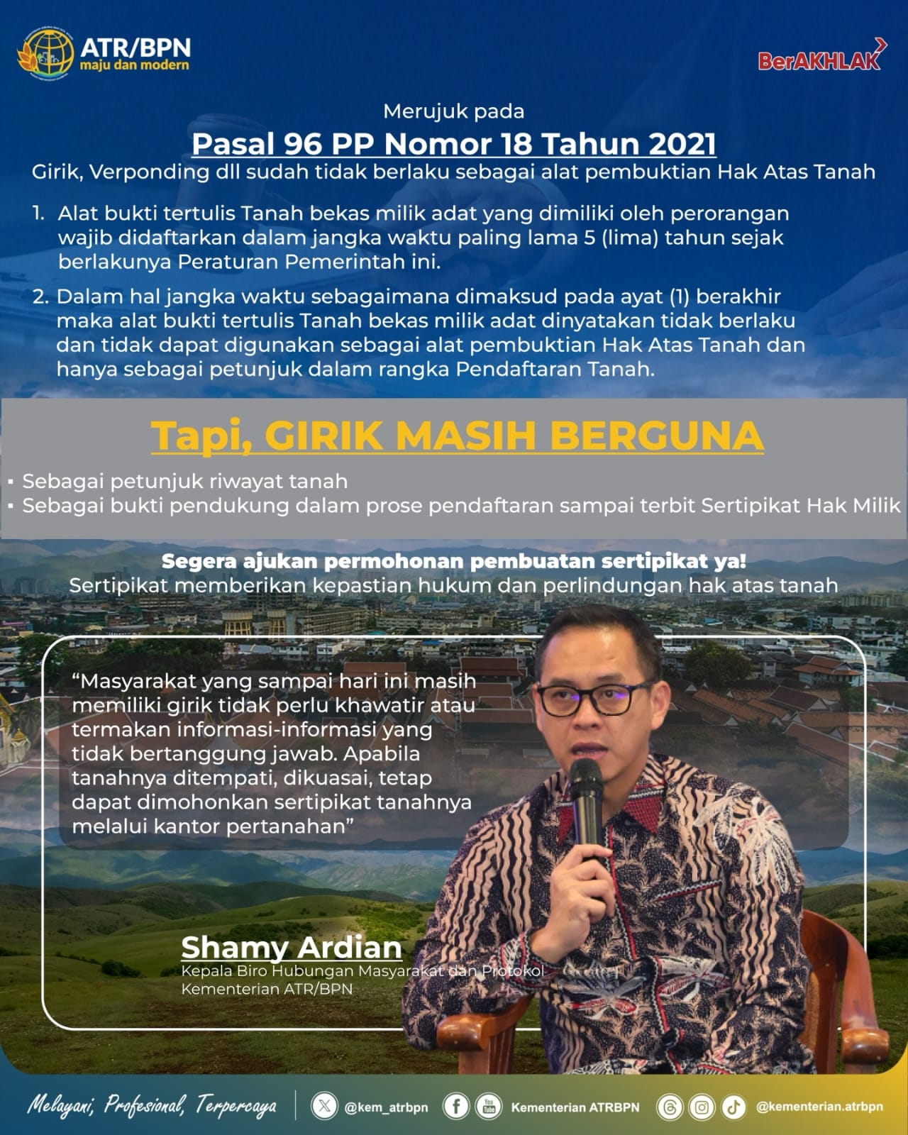 Serdang Bedagai | Harian.co.id,- Bukti kepemilikan tanah yang sah adalah Sertipikat Tanah, sedangkan Girik akan digunakan sebagai petunjuk dalam pendaftaran tanah.