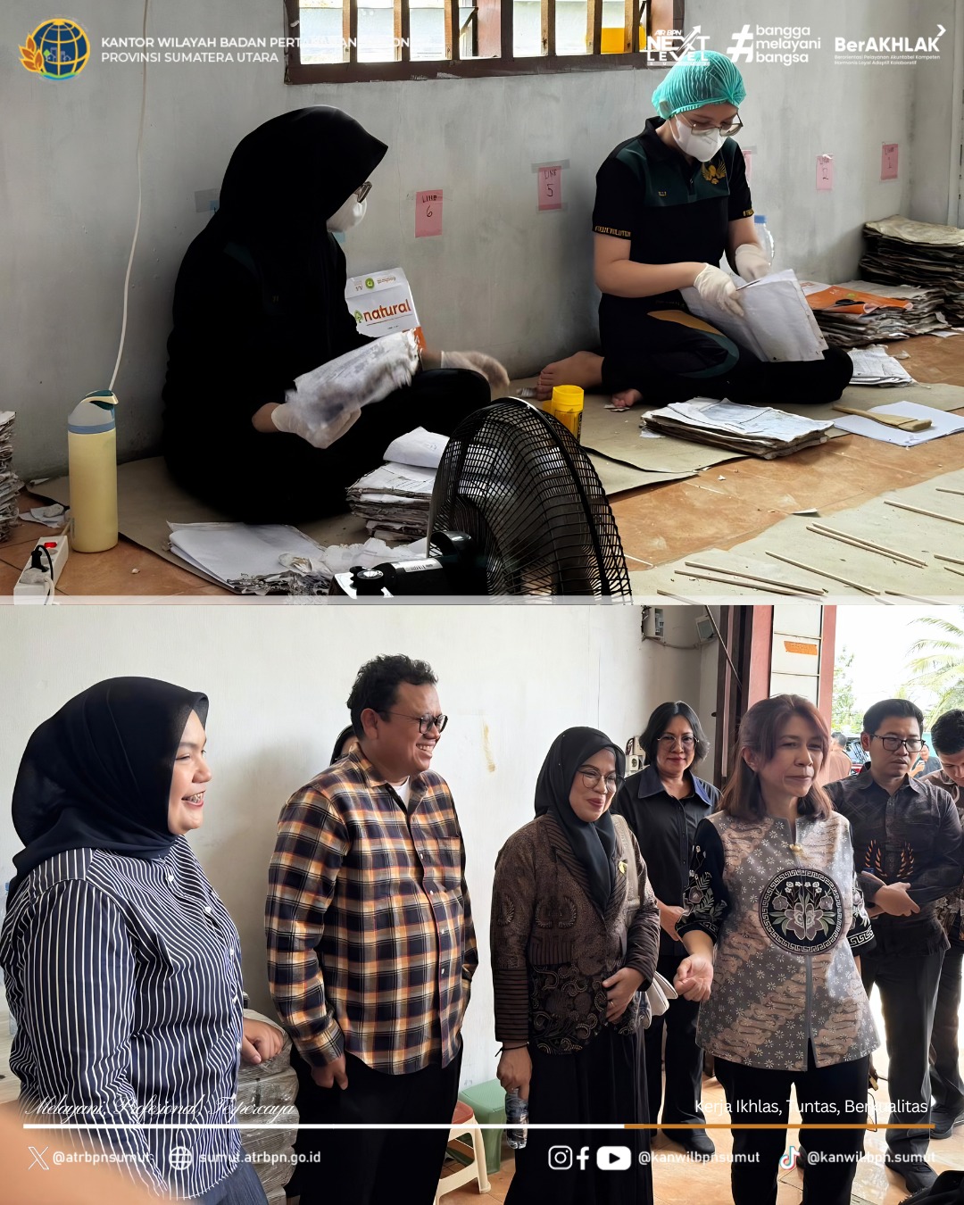 Kepala Biro Perencanaan dan Kerja Sama Kementerian ATR/BPN, Ibu Andi Tenri Abeng, bersama Kepala Biro Umum dan Layanan Pengadaan, Bapak Awaludin, melaksanakan monitoring dan evaluasi percepatan penanganan restorasi arsip Kantor Pertanahan Kabupaten Aceh Tamiang yang berlokasi di Kabupaten Langkat, Provinsi Sumatera Utara.