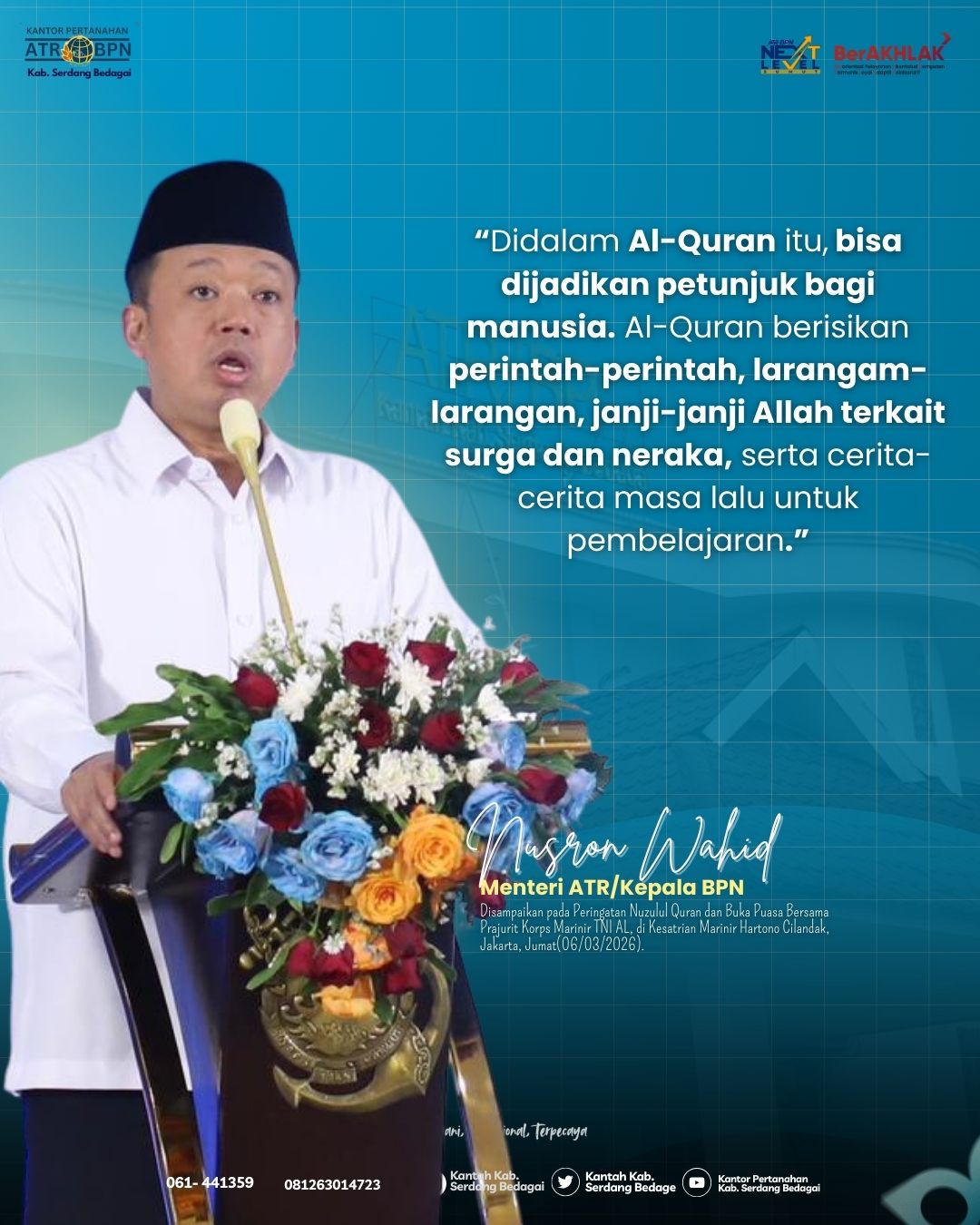 Jakarta | Harian.co.id,-Menteri Agraria dan Tata Ruang/Badan Pertanahan Nasional (ATR/BPN), Nusron Wahid, menyampaikan ceramah agama pada peringatan Nuzulul Quran dan buka puasa bersama prajurit Korps Marinir TNI Angkatan Laut di Gedung Aminullah Ibrahim, Kesatrian Marinir Hartono Cilandak, Jakarta, Jumat (06/03/2026). Dalam kesempatan tersebut, ia mengingatkan bahwa turunnya Al-Qur’an merupakan rahmat dan nikmat besar bagi umat manusia serta menjadi petunjuk hidup yang berisi perintah, larangan, dan pelajaran bagi umat beriman.