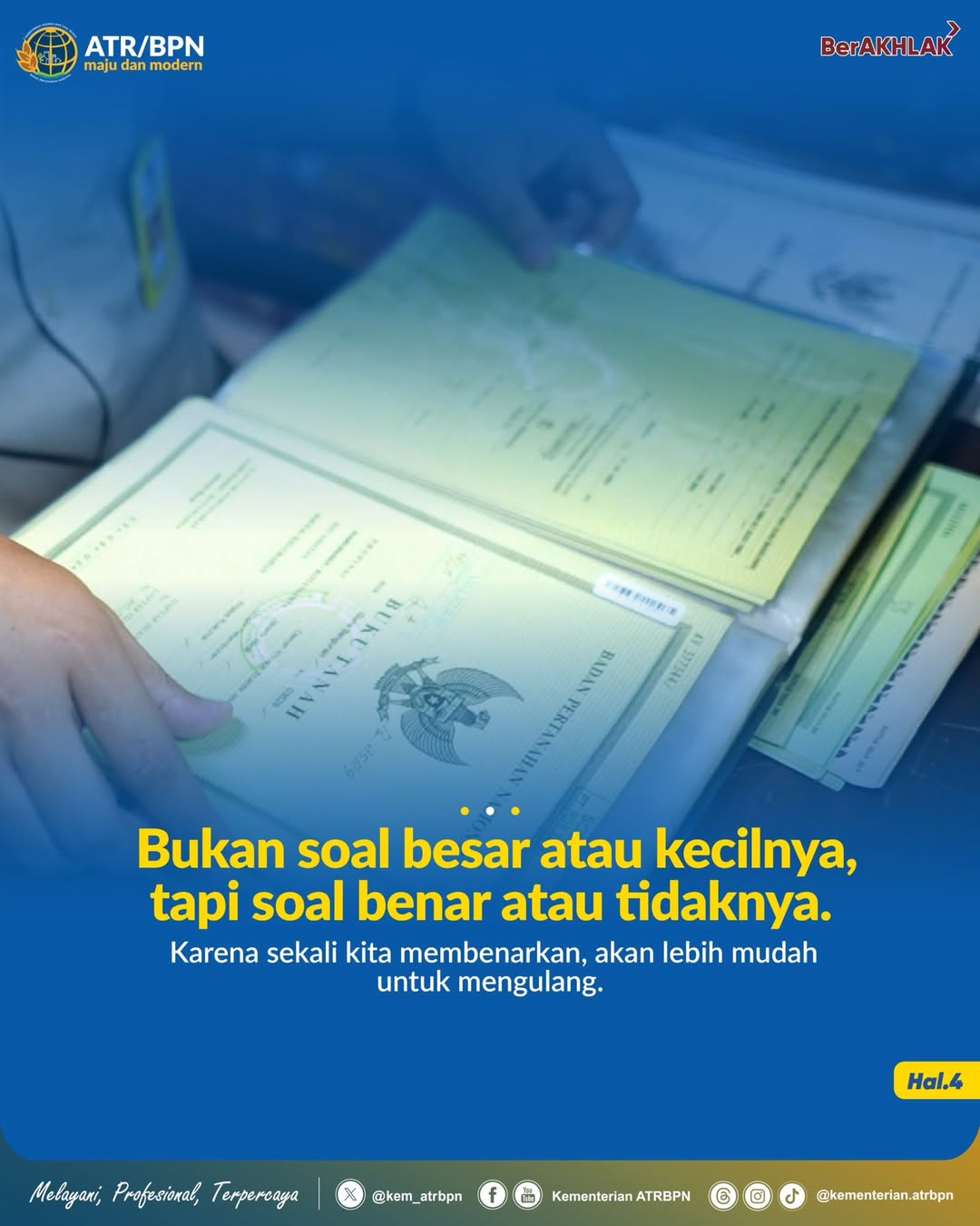Penguatan integritas menjadi bagian penting dalam pelaksanaan tugas dan fungsi pelayanan pertanahan. Hal ini tidak hanya tercermin dalam kebijakan dan prosedur kerja, tetapi juga dalam sikap dan perilaku setiap pegawai dalam menjalankan tugas sehari-hari. Integritas diuji tidak hanya pada situasi besar, melainkan juga pada hal-hal kecil yang kerap dianggap biasa, namun memiliki dampak signifikan terhadap kepercayaan masyarakat.