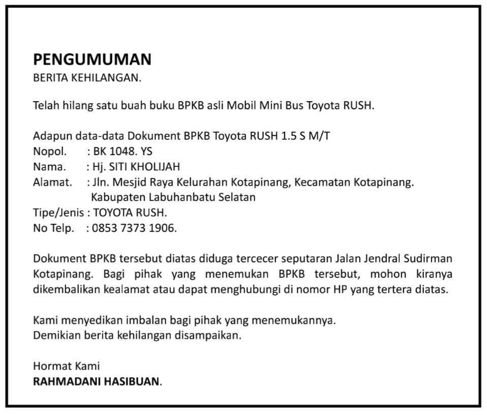 Beranda News Pengumuman (2), Telah Hilang Sebuah Buku BPKB Asli Mobil Mini Bus Toyota Rush BK1048YS NewsPengumuman (2), Telah Hilang Sebuah Buku BPKB Asli Mobil Mini Bus Toyota Rush BK1048YSredaksi0 min bacaNovember 30, 2023Desember 1, 2023328×Pengumuman (2), Telah Hilang Sebuah Buku BPKB Asli Mobil Mini Bus Toyota Rush BK1048YSSebarkan artikel ini Dibaca: 328 Pos TerkaitNewsApel Pagi Rutin Diikuti Seluruh Jajaran Pegawai Kantor Wilayah Badan Pertanahan Nasional Provinsi Sumatera Utara.NewsKantor Pertanahan Kabupaten Serdang Bedagai Melaksanakan Rapat Monitoring dan Evaluasi Pelayanan Pembangunan Zona Integritas Menuju WBKFoodsPerkuat Gizi Pelajar, Polres Nias Selatan Resmikan MBG SPPG Merah Putih di AramoNewsRespon Cepat Aduan 110, Kapolsek Torgamba Gerak Cepat Tindaklanjuti Jembatan Nyaris RobohNewsTinjau Pelayanan Kantah Kota Semarang, Wamen Ossy: Jangan Tunda Berkas, Percepat Layanan PertanahanNewsTinjau Kawasan Industri di Indramayu, Menteri Nusron Pastikan Lahan Tidak Masuk ke LSD