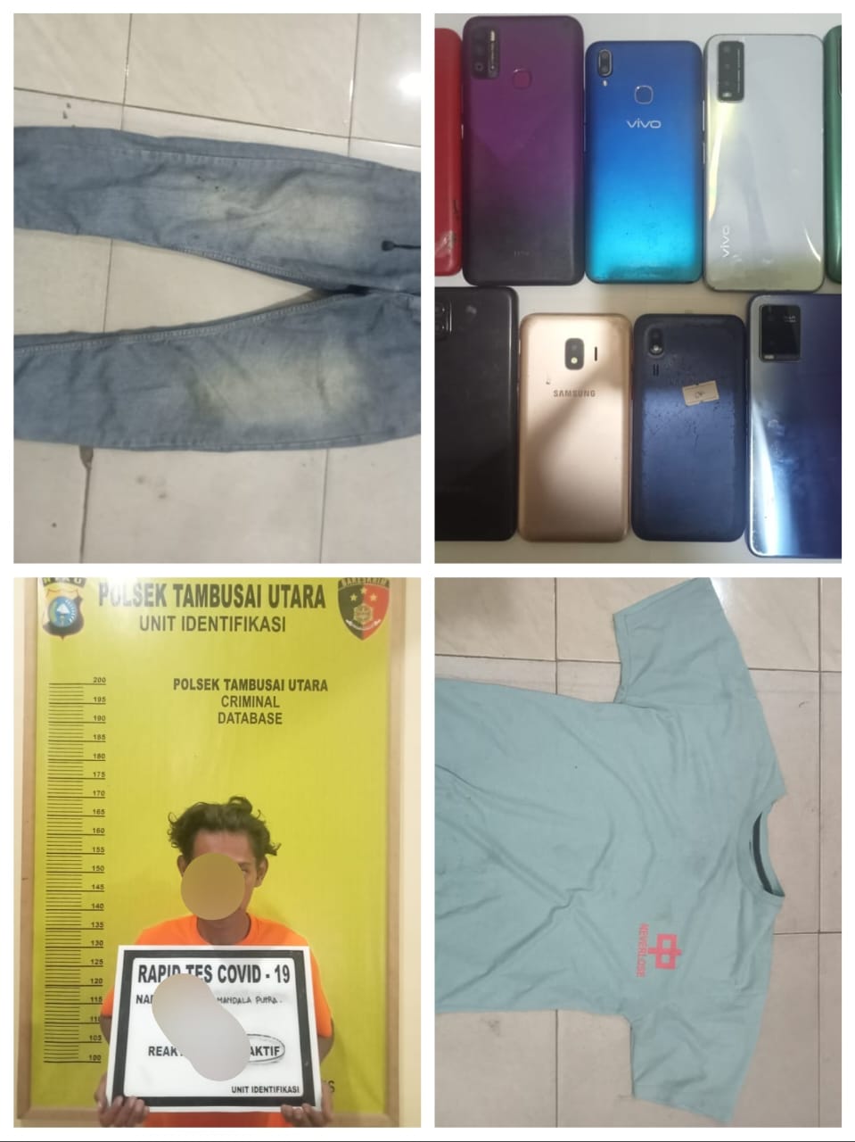 “Barang bukti yang diamankan berupa 11 unit ponsel Android yang dibungkus dalam kantong hitam dan dilapisi jaket putih-biru di dalam tas kecil hitam bertuliskan ‘Nirvana’, satu kaos lengan pendek warna biru, dan satu celana panjang Levis warna biru,” rinciannya.