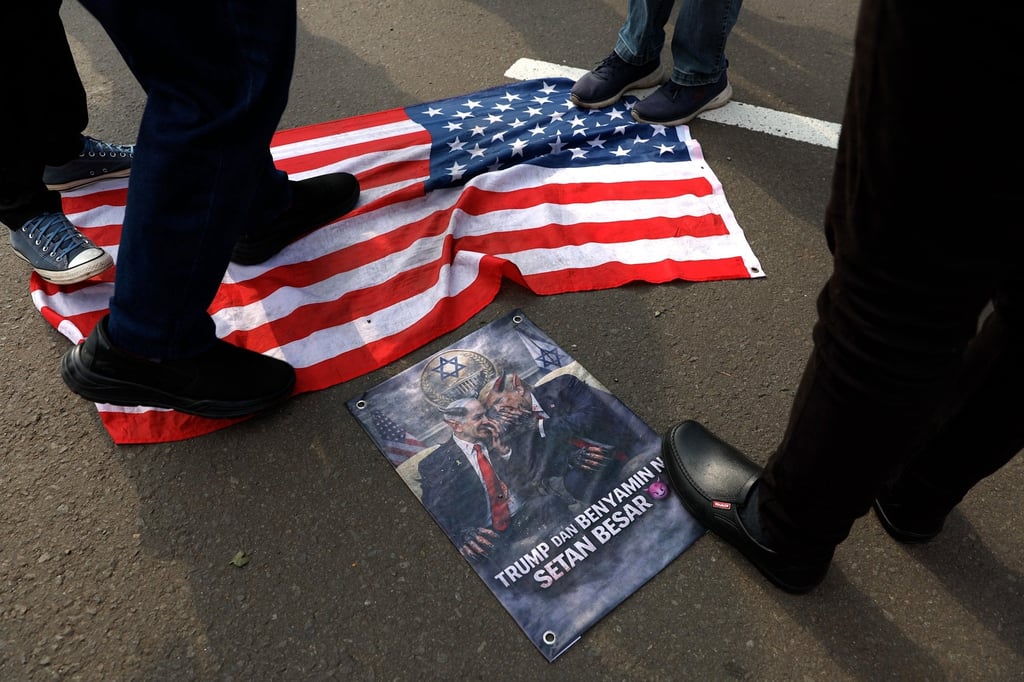 Pengunjuk rasa Indonesia menginjak bendera AS saat unjuk rasa di luar Kedutaan Besar AS di Jakarta pada 13 Maret. Foto: EPA