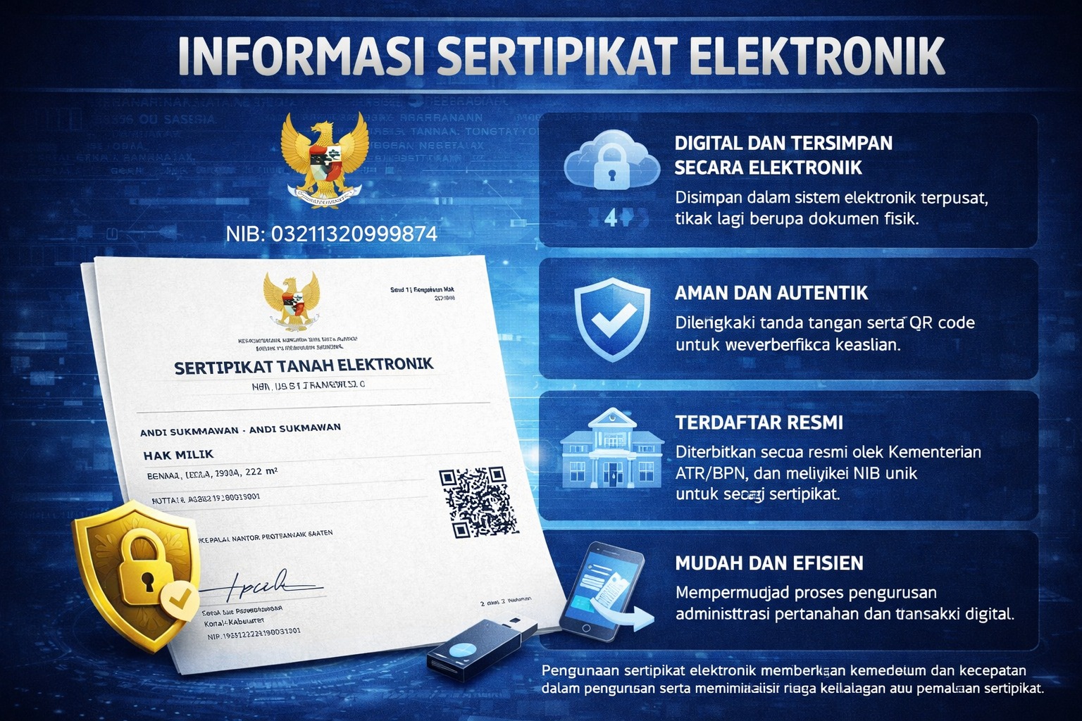 Sertipikat elektronik dilengkapi dengan fitur keamanan seperti tanda tangan elektronik dan QR Code yang dapat diverifikasi untuk memastikan keaslian dokumen. Selain itu, setiap sertipikat memiliki Nomor Induk Bidang (NIB) yang bersifat unik, sehingga memudahkan identifikasi dan mengurangi risiko pemalsuan maupun kehilangan data.
