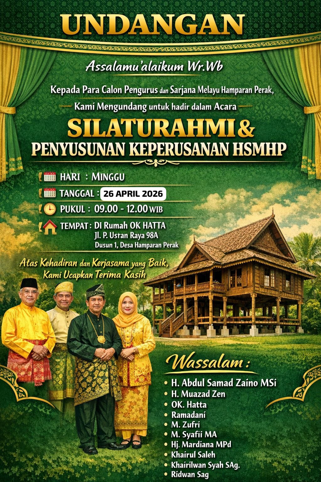 Kegiatan ini dijadwalkan berlangsung pukul 09.00 hingga 12.00 WIB, bertempat di kediaman OK. Hatta, SH, MH, di Jalan P. Usman Raya No. 98 A, Dusun I, Desa Hamparan Perak, Kecamatan Hamparan Perak, Kabupaten Deli Serdang, Sumatera Utara.