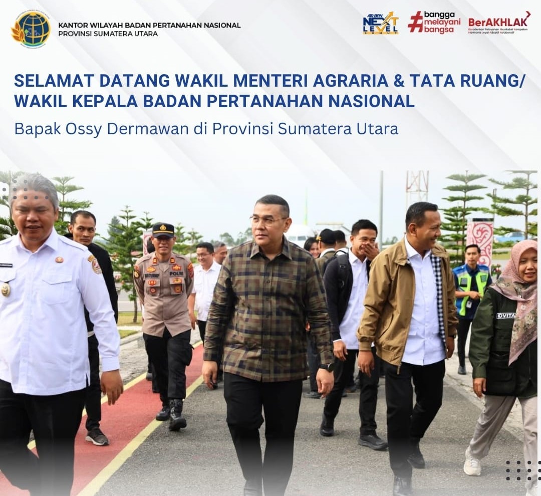 Sumatera Utara | Harian.co.id,- Selamat datang Wakil Menteri Agraria dan Tata Ruang/Wakil Kepala Badan Pertanahan Nasional, Bapak Ossy Dermawan di Provinsi Sumatera Utara, diharapkan kunjungan ini dapat memberikan arahan, penguatan kebijakan, serta dorongan semangat bagi seluruh pegawai di lingkungan Kantor Wilayah BPN Provinsi Sumatera Utara.