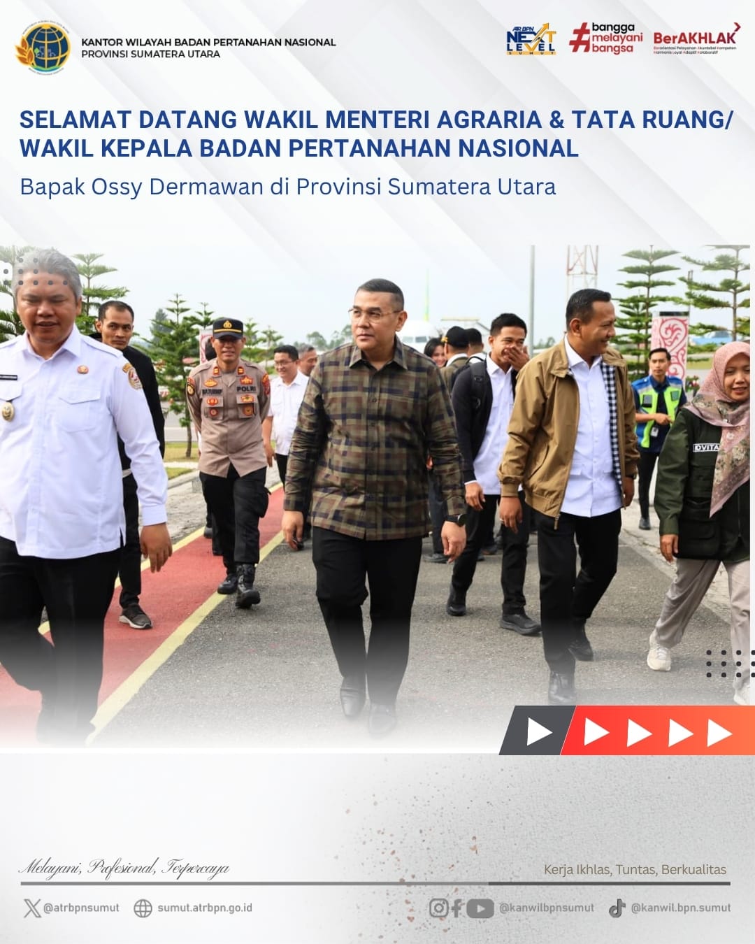 Sumatera Utara | Harian.co.id,- Selamat datang Wakil Menteri Agraria dan Tata Ruang/Wakil Kepala Badan Pertanahan Nasional, Bapak Ossy Dermawan di Provinsi Sumatera Utara, diharapkan kunjungan ini dapat memberikan arahan, penguatan kebijakan, serta dorongan semangat bagi seluruh pegawai di lingkungan Kantor Wilayah BPN Provinsi Sumatera Utara.