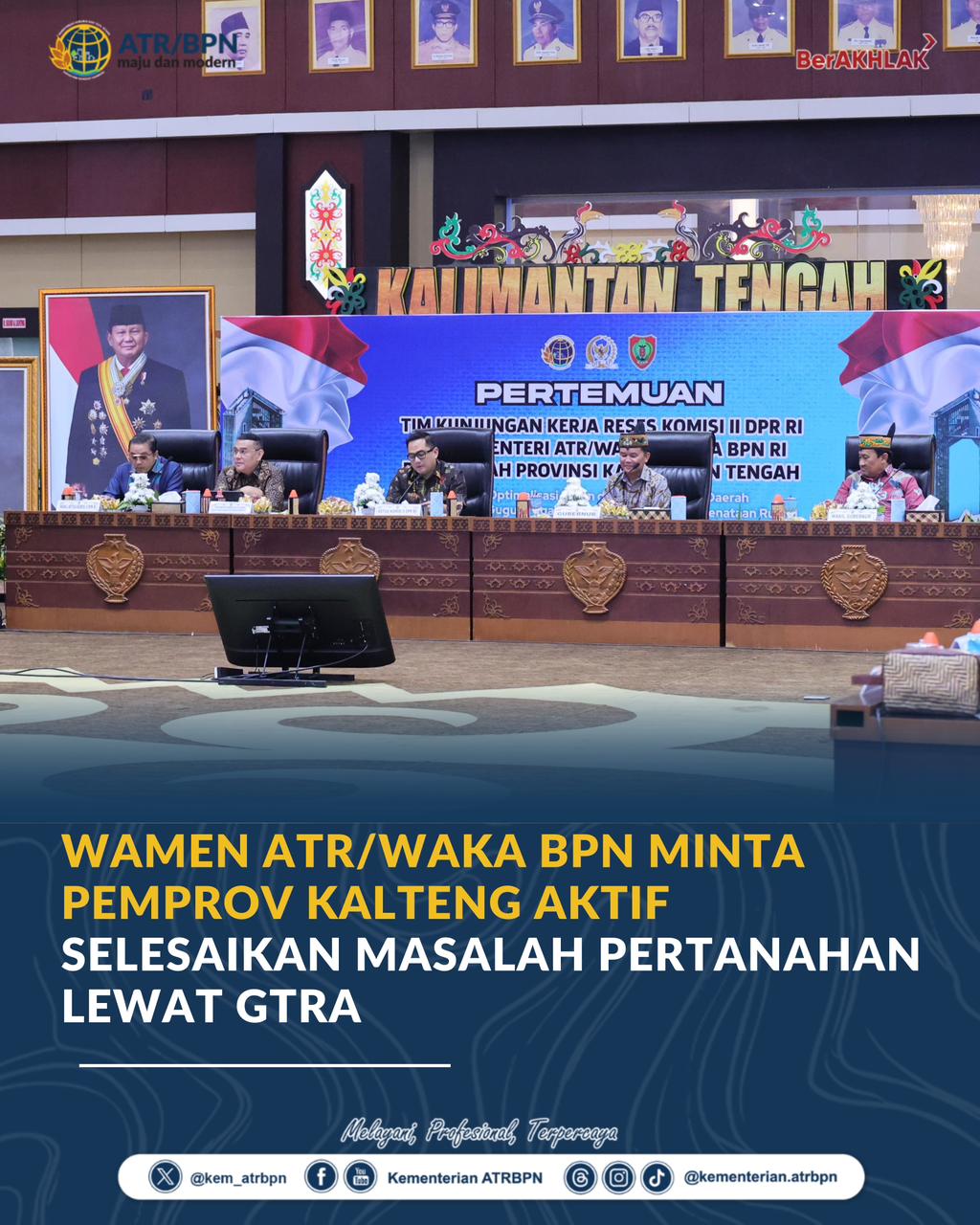 “Kewenangan Bapak/Ibu Kepala Daerah di provinsi ini sangat besar, dan dapat membantu mengelola pertanahan di tempat Bapak/Ibu sekalian melalui forum Gugus Tugas Reforma Agraria (GTRA). Jika ada konflik pertanahan, aktifkan GTRA agar kita bisa mencari solusi,” ujar Wamen Ossy di Aula Jaya Tingang, Kantor Gubernur Kalteng.