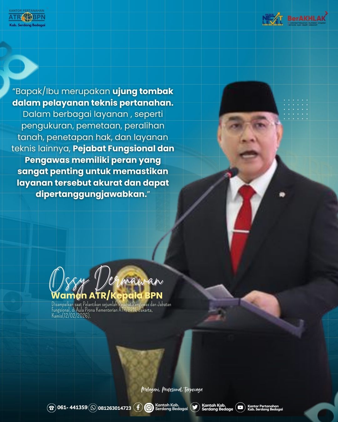 Wamen Ossy menyampaikan bahwa Pejabat Pengawas dan Pejabat Fungsional memiliki peran strategis dalam berbagai layanan teknis pertanahan, mulai dari pengukuran, pemetaan, peralihan hak, hingga penetapan hak atas tanah. Karena itu, setiap kebijakan dan layanan yang diberikan harus akurat, dapat dipertanggungjawabkan, serta mampu diimplementasikan dengan baik di lapangan.